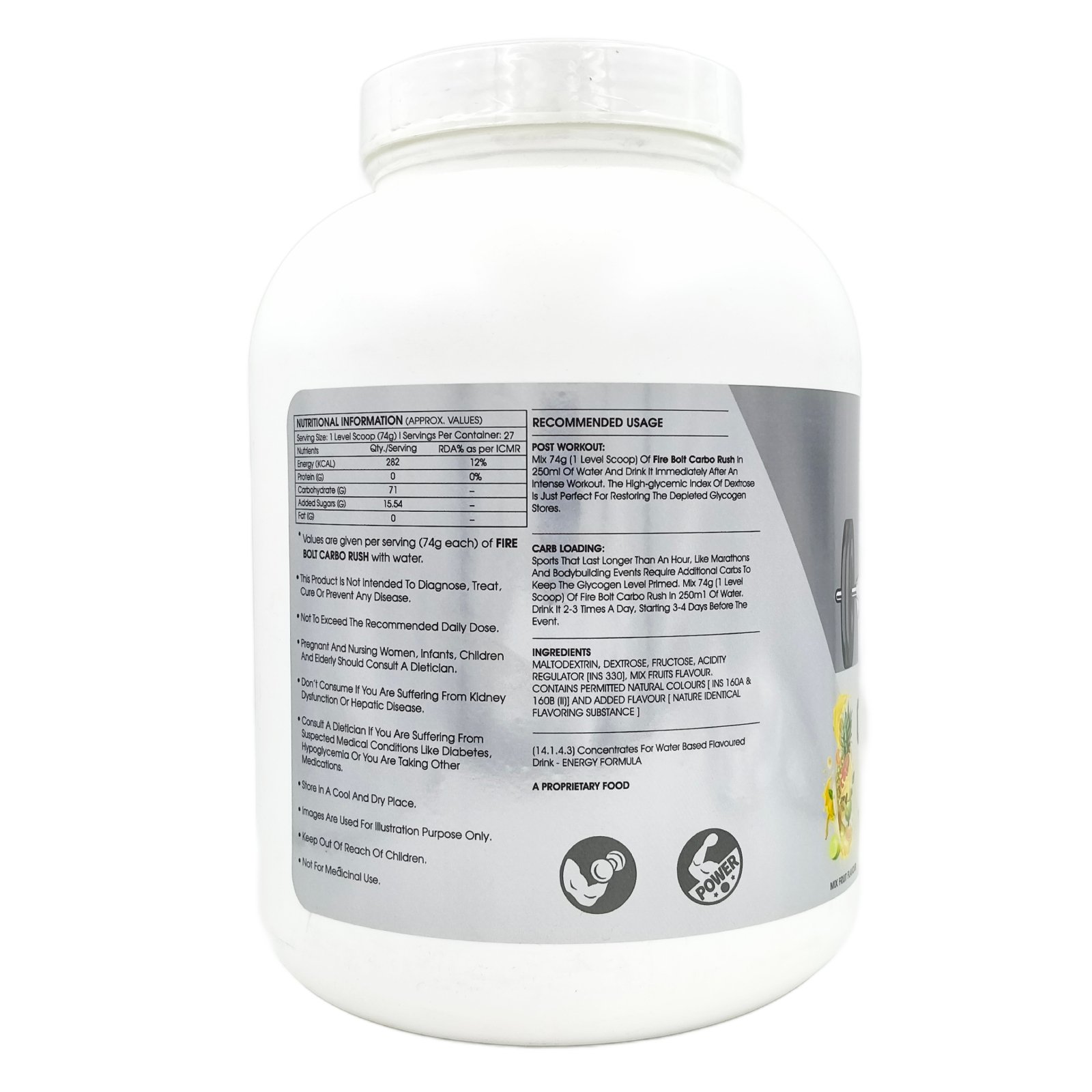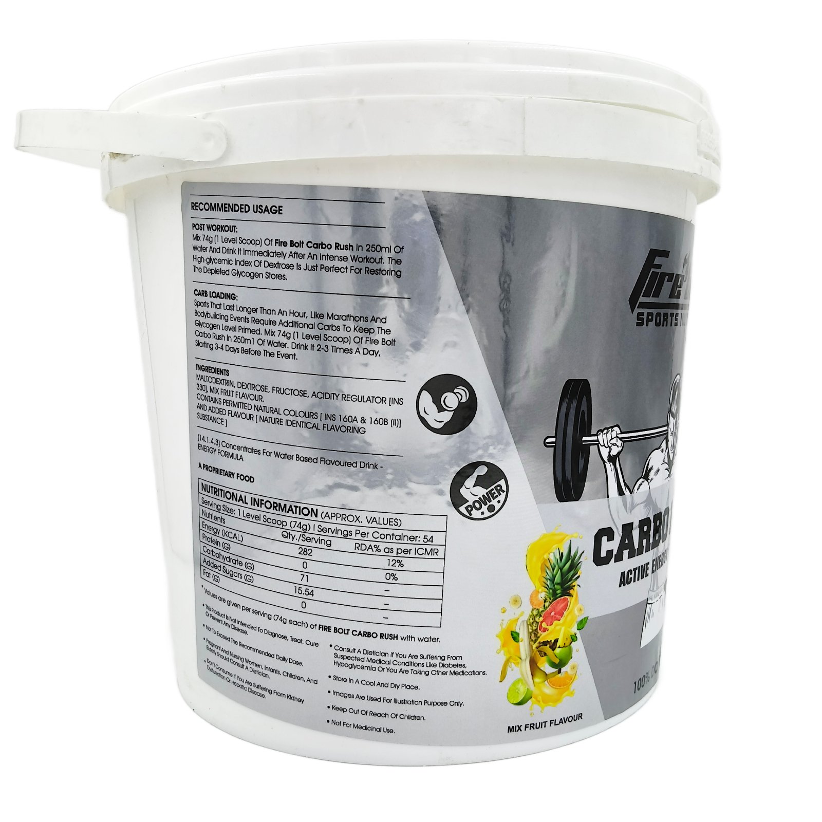 Mix 74g (1 Level Scoop) Of Fire Bolt Carbo Rush In 250ml Of Water And Drink It Immediately After An Intense Workout. The High-glycemic Index Of Dextrose Is Just Perfect For Restoring The Depleted Glycogen Stores.